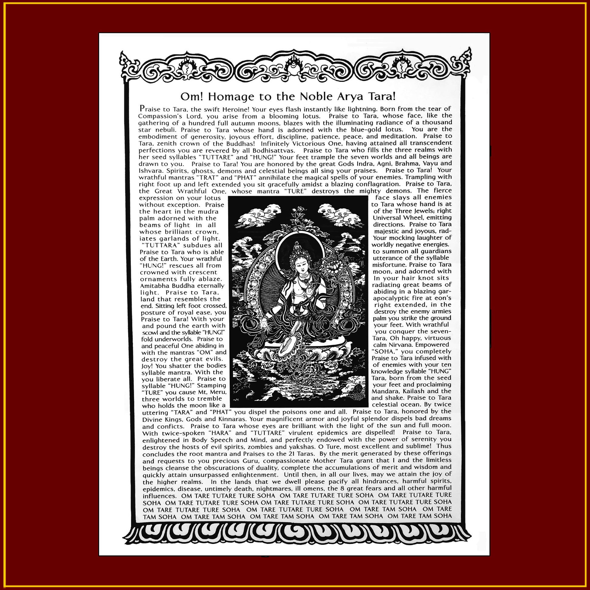 This beautiful prayer flag is an English translation of our traditional Tibetan flag (PF-5). It is the same size and the artwork is the same. The two look nice side by side. At one time Avalokiteshvara, the Bodhisattva of compassion, emptied all of the hell realms. But as he looked again the hell realms were immediately refilled. This flag is an English translation of the Tibetan original. The text reads like poetry in 21 stanzas. As he shed tears for these beings one tear transformed into the saviouress Green Tara who manifested her twenty other forms. The Tibetan script on this traditional flag praises Tara in all her manifestations. The verses conclude with her root mantra "OM TARE TU TARE TURE SOHA," the magical syllables that evoke the goddess.