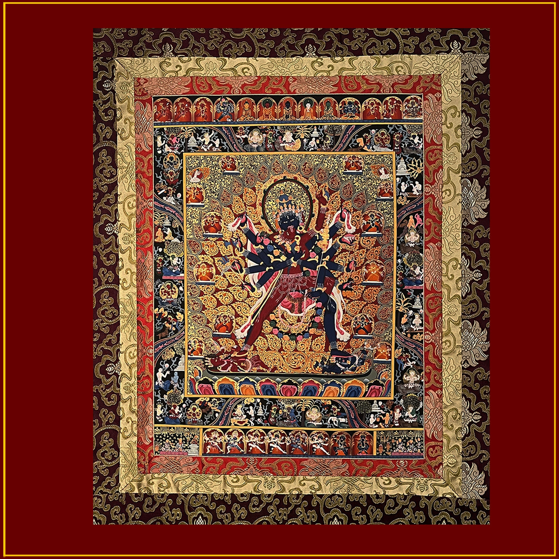 Chakrasamvara is a central yidam in Vajrayana Buddhism, especially within Highest Yoga Tantra, whose name means “Wheel of Supreme Bliss.” He embodies the profound union of bliss and emptiness, the heart of tantric realization. Though depicted in fierce, wrathful form—blue in color, crowned with skulls, adorned with bone ornaments, and trampling delusive forces—he is not a deity of rage but a powerful symbol of awakened compassion and transformative wisdom. Often shown in union with his consort Vajravārāhī, Chakrasamvara represents the inseparability of method and wisdom, form and emptiness. His iconography—multiple faces and arms, dynamic posture, and symbolic implements—is rich with tantric meaning, designed to jolt the practitioner out of dualistic perception. Revered in Kagyu, Gelug, Nyingma, and Sakya lineages, the Chakrasamvara Tantra includes advanced yogic practices such as visualization, mantra recitation, and inner heat yogas, guiding the practitioner toward the realization of non-dual awareness. Ultimately, Chakrasamvara is not outside the mind but reflects its most liberated and luminous nature.