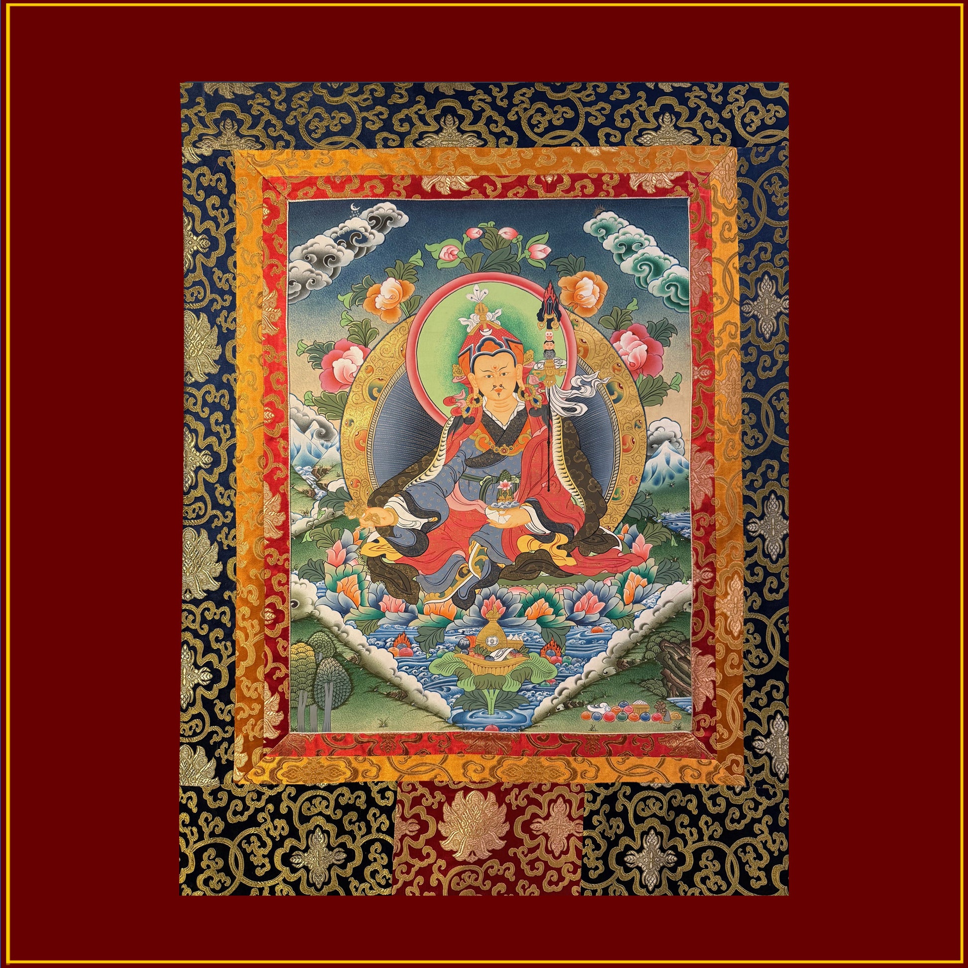 This is a fairly large thangka painting. Guru Rinpoche is depicted in the aspect called "Vajra Posture of Subjugation." The vajra in the lowered right hand shows that Guru Rinpoche is firmly grounding awakened activity into the world. It’s not abstract wisdom — it’s wisdom applied to subdue harmful forces and protect beings .Placing the hand on the knee expresses readiness and engagement, as opposed to a hand folded in meditation. It’s a gesture of dynamic compassion, willing to act. In Tibetan descriptions, this posture is often called “the gesture of subjugating the three realms” meaning Guru Rinpoche holds mastery over samsara’s appearances — gods, demons, and humans alike.