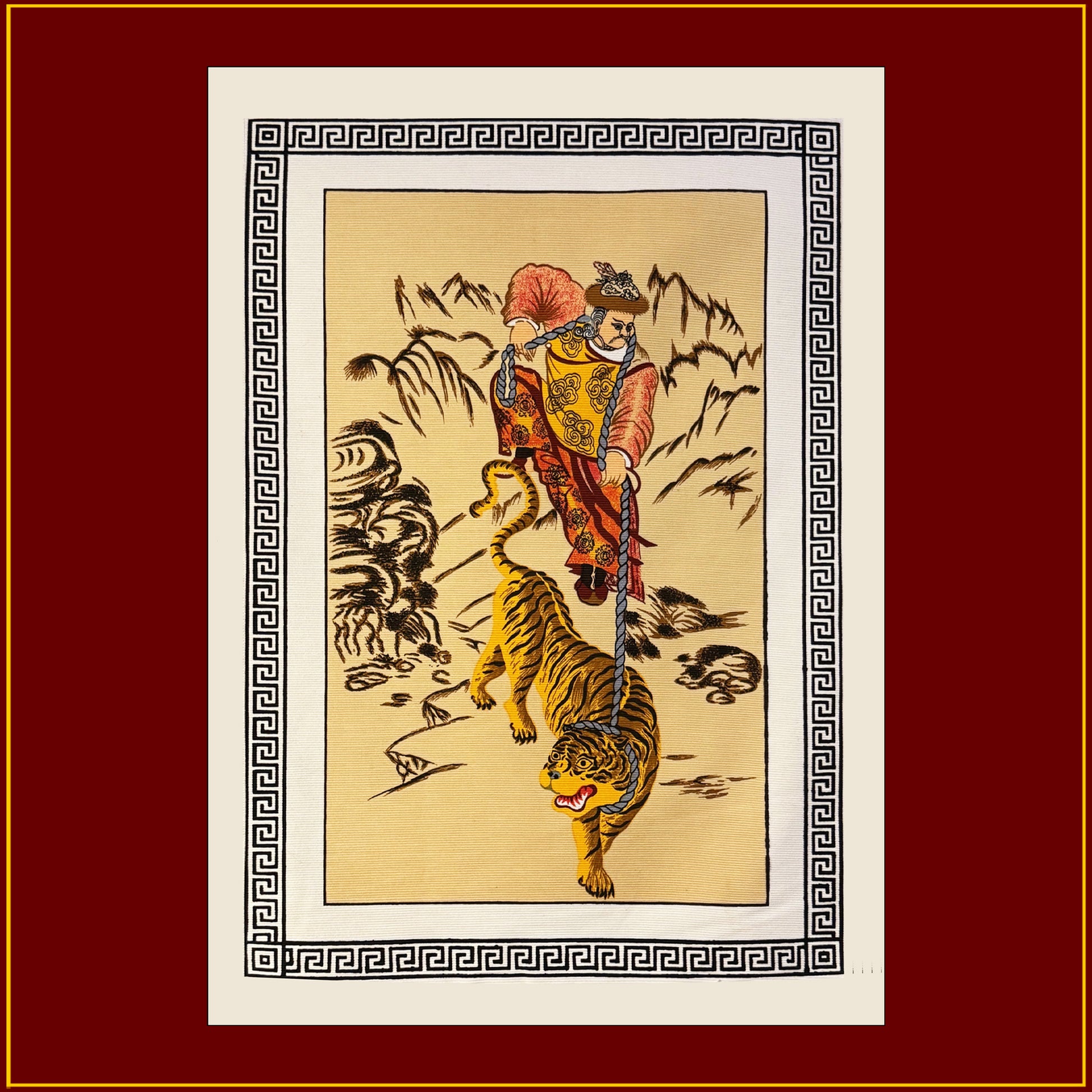 In this hanging, a calm figure leads a tiger on a loose rope. No struggle, no fear. The pairing is intentional: refined human and untamed power. The tiger represents raw life-force — desire, anger, instinct, creative fire — the very energies that, untrained, can devour us. In Vajrayana these forces are not rejected, but transformed. The goal is not to cage the tiger, but to walk beside it.